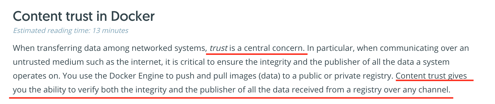 Docker는 Docker Content Trust (DCT)라는 기능으로 악의를 가진 제3자의 행동들로 부터 사용자를 보호한다.