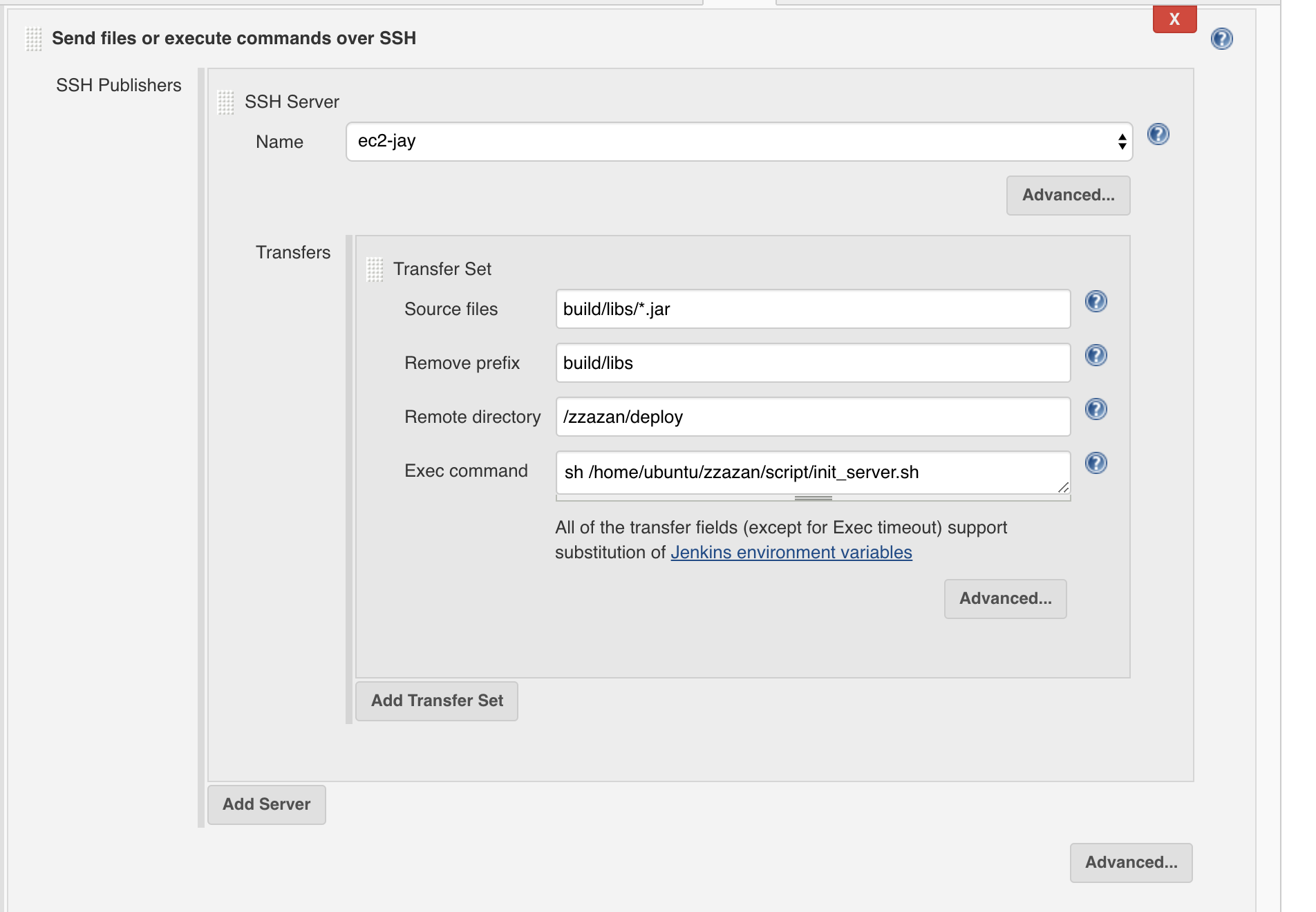 Remote Directory: 파일을 전송할 원격 서버의 디렉터리를 명시하는 부분이다. 이 부분에서 조심해야 할게 아까 젠킨스의 서버 친구 맺기에서 설정한 폴더 기준으로 적어야 한다. 그 쪽에서 /home/ubuntu 라고 적어줬기 때문에 그 밑의 경로를 적는다. 사진에서는 /zzazan/deploy 라고 되어 있다. zzazan은 애플리케이션 이름이고 deploy라는 폴더는 jar 파일을 넣어놓기 위한 폴더로 사용하려고 만들어 놓았다. 미리 서버에 들어가서 저 폴더를 만들어 놓자.