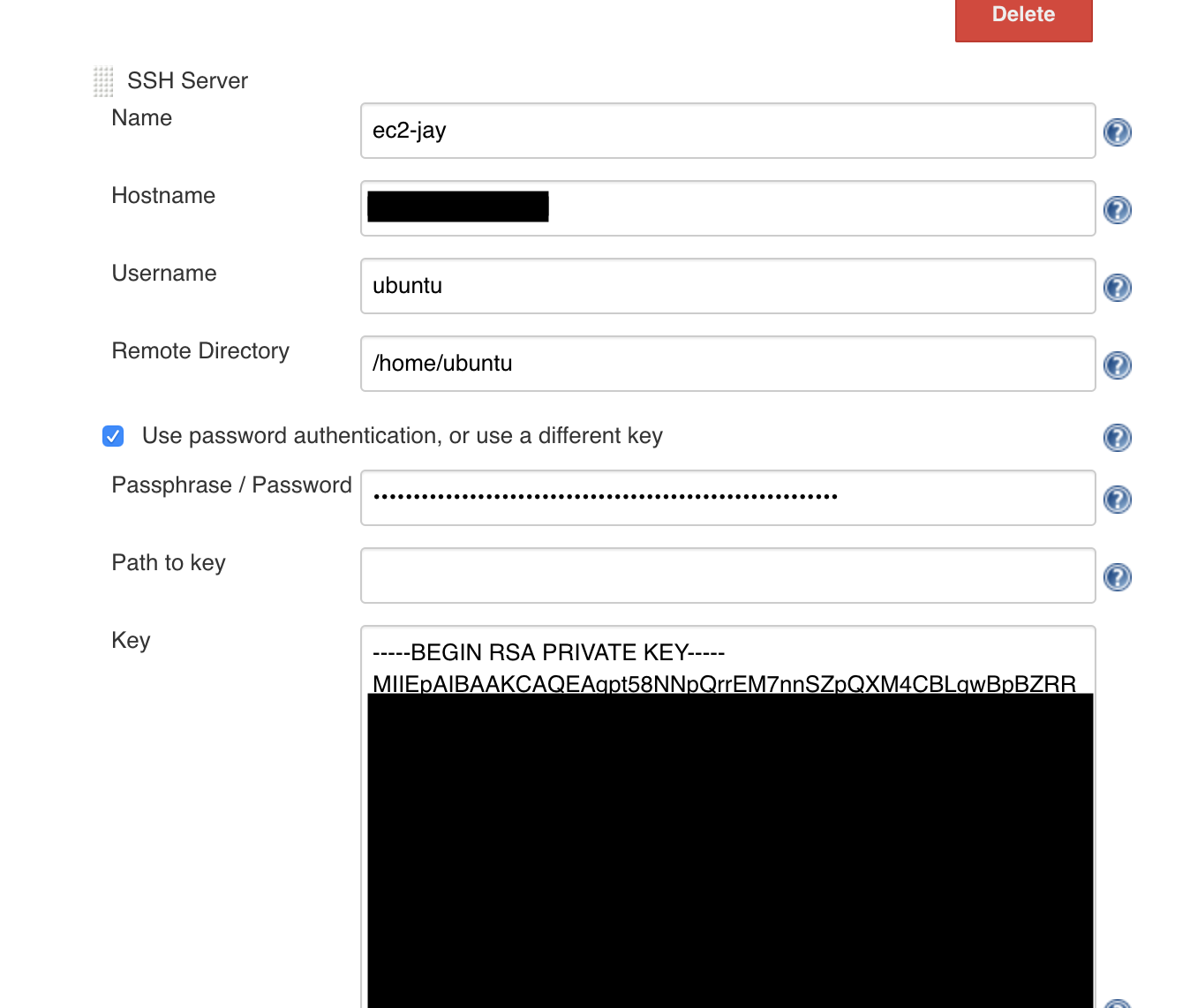 Advanced 탭을 누르면 체크 박스부터 밑으로 쭉 펼쳐지는데 그곳에서 서버를 등록해준다. 필자는 Ubuntu 서버를 pem 키를 통해 등록했는데 pem 키를 cat 해서 열어보면 RSA 키가 나오는데 그것을 Key에 등록해준다. 혹은 비밀번호로 서버에 접속한다면 키 등록 말고 비밀번호 등록으로 해도 된다.