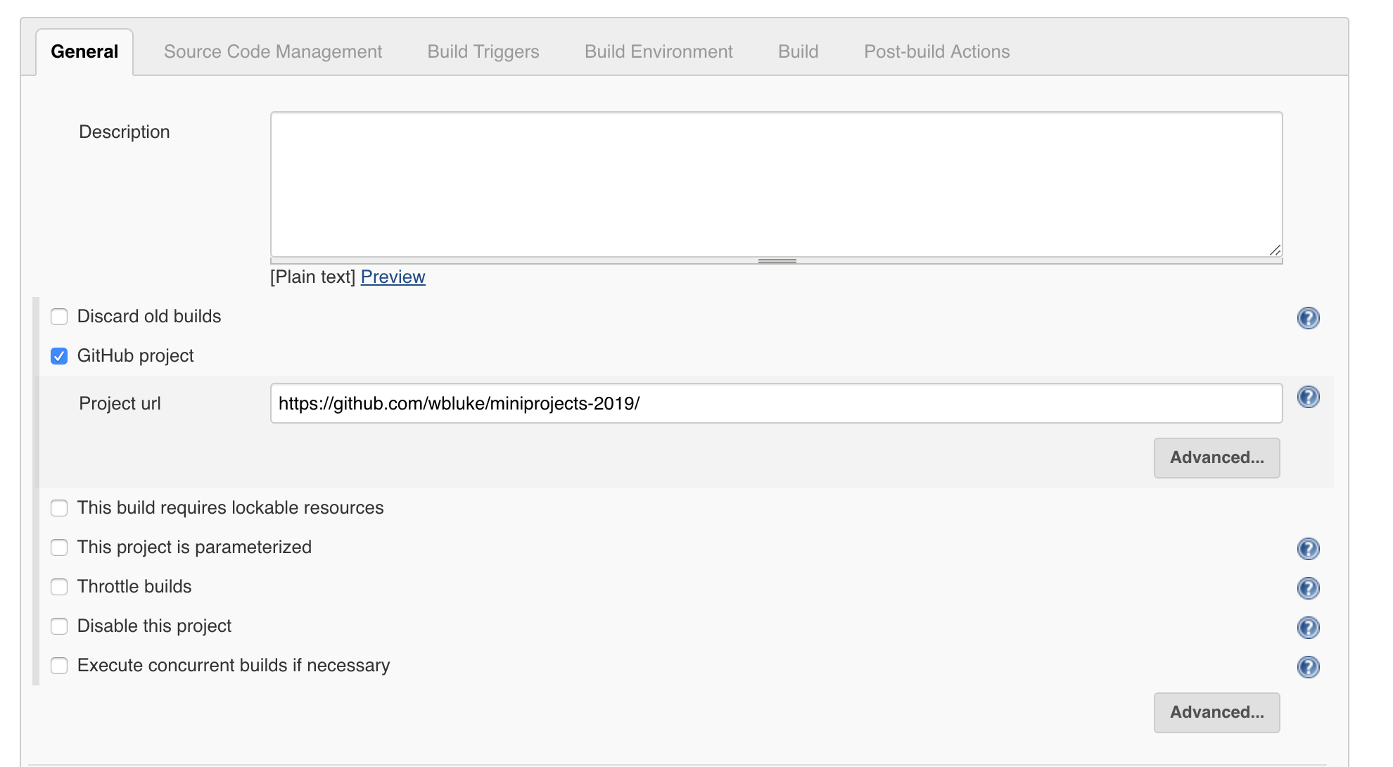 일반 환경설정에서 GitHub Project를 선택하고 url을 입력한다.