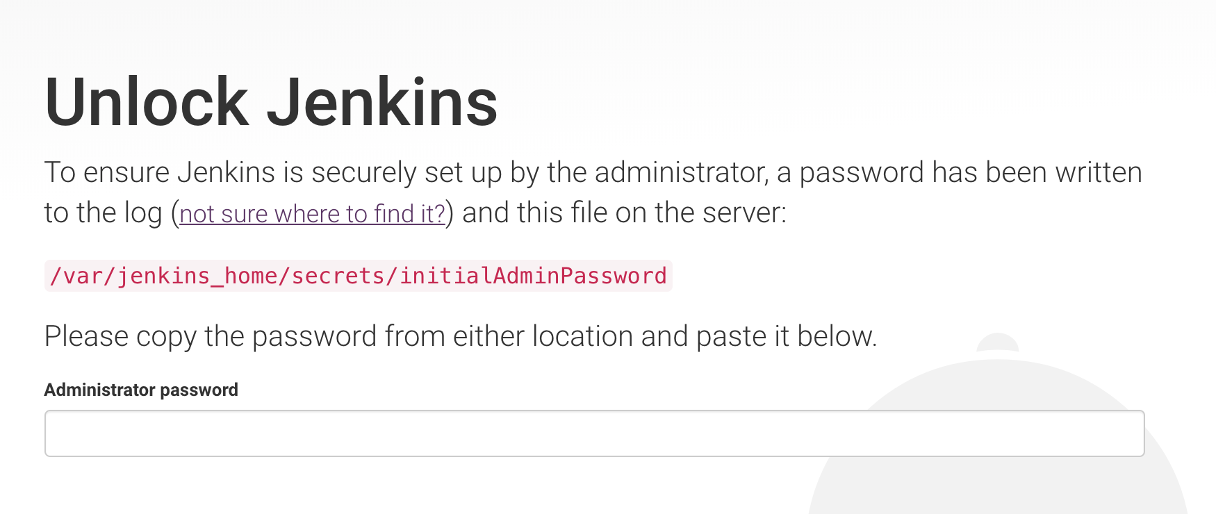 요 언락 화면이 나올텐데 초기 접속화면은 비밀번호를 입력해야 한다 (최초 한번). 도커로 설치 했을 경우, 컨테이너의 로그를 확인하면 비밀번호를 얻을 수 있다. (일반 설치의 경우 /var/jenkins_home/secrets/initialAdminPassword 를 관리자 권한으로 열면 비밀번호가 들어있다)