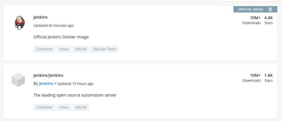 도커 허브에 가보면 젠킨스의 공식 이미지가 있다. 주의할 것은 어떤 jenkins 이미지를 받아오느냐이다. 처음에 official image를 받았는데 jdk 8 환경에서 설치 후 젠킨스 환경 설정이 제대로 되지 않았다. 여러번 삽질 끝에 그 밑에 있는 open source 버젼을 받았다. 이름은 jenkins/jenkins이고 업데이트 날짜를 확인해보라. latest TAG는 무려 글쓴 시간 기준 3 Hours ago 이고 offcial image는 latest가 1 year ago 이다. 아마 jenkins/jenkins 라는 이미지가 계속 해서 업데이트되고 있는 듯 하다.