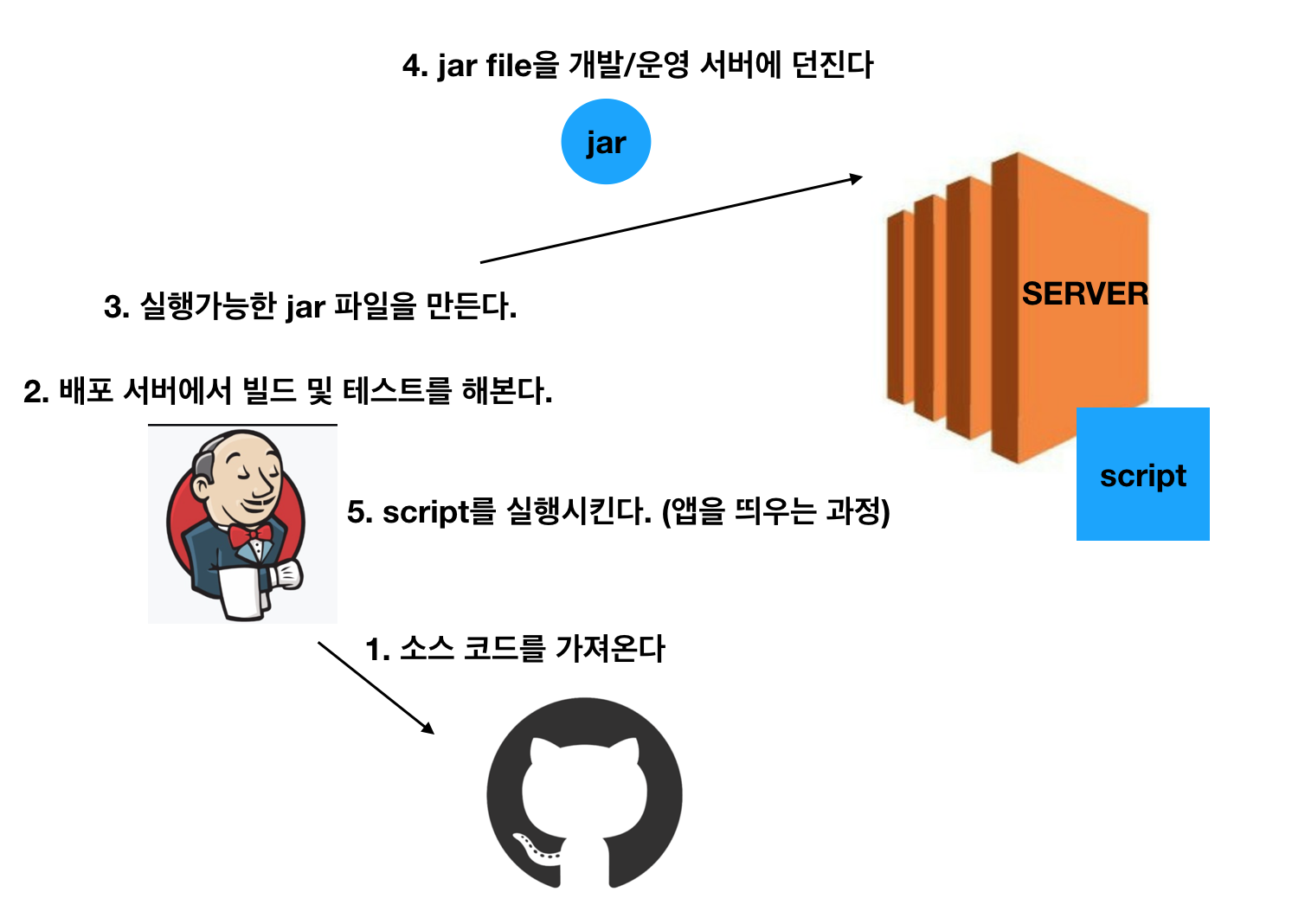 소스코드를 깃허브를 참조하여 가져온다. (브랜치 별로 명시할 수 있는데 밑에서 자세히 설명하겠다) 그리고 직접 빌드 및 테스트를 한다. 물론 이 과정에서 jar 파일이 만들어진다. (정확히 말하자면 2번후 3번이 아니라 2번과정에서 3번이 만들어 지는 것) 그리고 그 jar 파일을 ssh 연결을 통해서 보내려는 서버에 전송한다. 전송 이후 그 서버에 존재하는 스크립트를 실행한다.