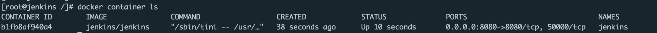 -v: 볼륨 옵션은 위에서 언급한 호스트와 볼륨을 공유하는 설정이다. 콜론 왼쪽이 내 호스트 서버의 루트경로를 잡아온다. 저렇게 쓰게되면 루트에 jenkins라는 폴더가 생길 것이다. 그리고 그 폴더를 실제 컨테이너 내부의 젠킨스 폴더인 /var/jnkeins_home이라는 폴더와 매핑이 된다. 젠킨스가 나중에 빌드하고 난 결과물들을 직접 호스트에서 공유할 수 있다.