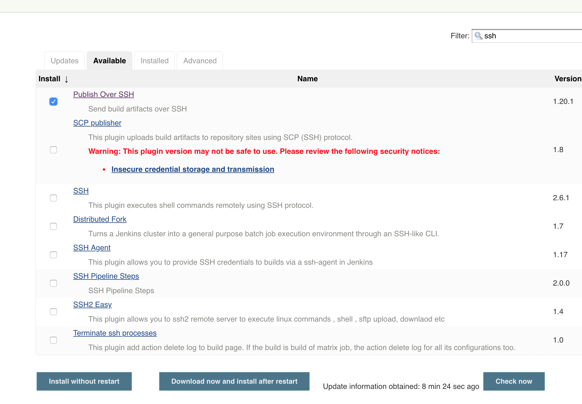 검색창에 ssh 라고 치면 Publish Over SSH 라는 플러그인이 보일 것이다. 저것을 선택하고 Download now and install after restart를 눌러주고 설치하자. 그러면 젠킨스가 재시작될 것이다. 이 플러그인을 설치하는 이유는 다른 서버에 ssh 연결을 통해서 작업을 시키기 위해서이다.