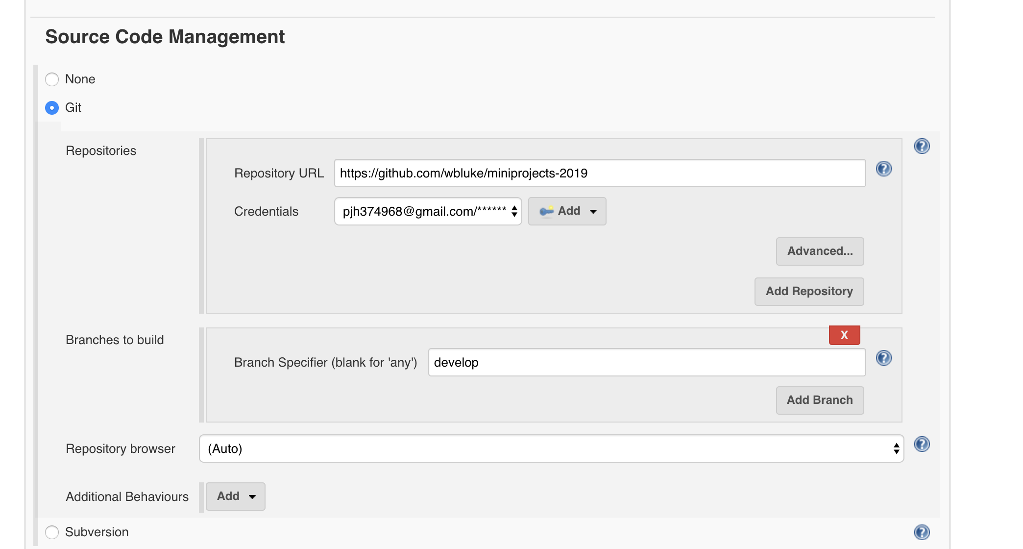 Git을 선택하고 url을 한 번 더 입력 후 Credential을 등록한다. 저것은 자신의 깃허브 아이디를 등록하면 되는데 Advanced를 눌러서 아이디 비밀번호를 입력하고 셀렉트 박스를 눌러서 선택하면 등록할 수 있다. 그리고 빌드할 브랜치를 명시한다. 사진은 개발용 서버로 쓸 예정이니 develop 브랜치로 잡아보았다.