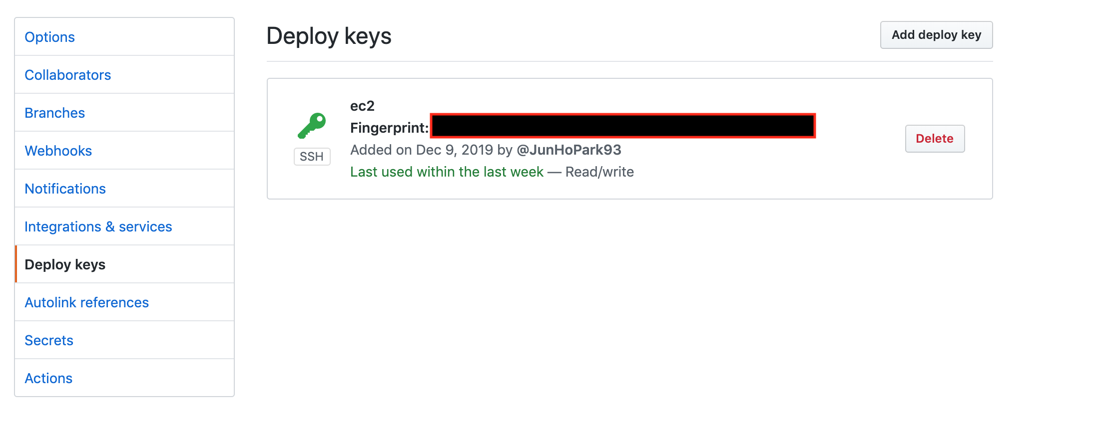 이제 다음과 같은 명령어로 공개키를 열어보면 공캐기가 나오게되는데 이것을 GitHub 레포지토리에 Deploy Keys에 들어가서 넣어주면 됩니다.