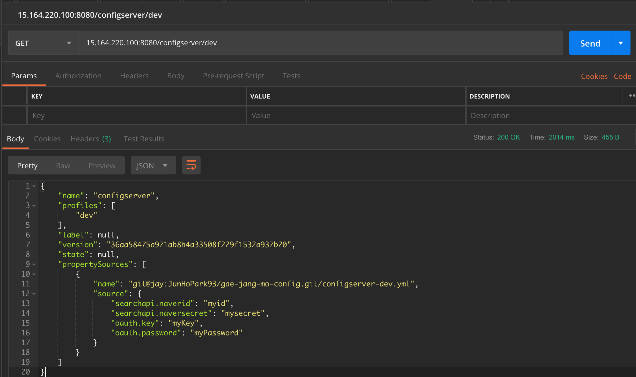 참고로 요청 url은 {application-name}-{profile}.yml 파일 기준으로 {ip}:{port}/{application-name}/{profile} 입니다. 대시 대신에 슬래시를 넣어서 컨피그 서버를 띄운 포트로 요청을 보내면 됩니다.