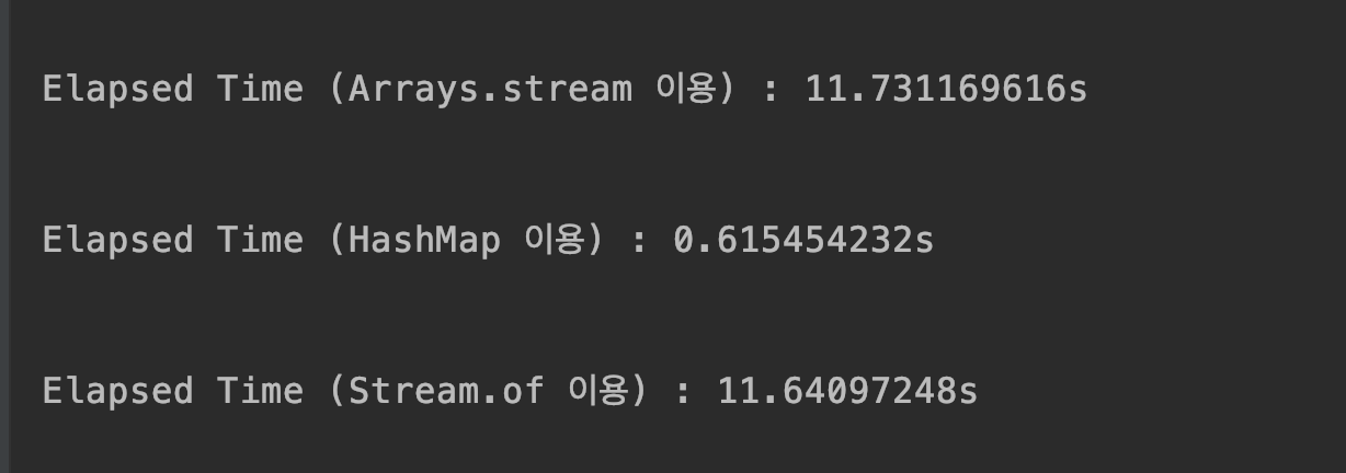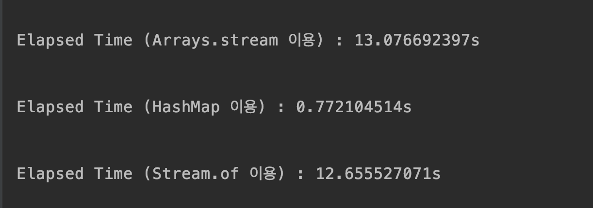 System.out.println("Elapsed Time (HashMap 이용) : " + stopWatch.getTotalTimeSeconds() + "s");